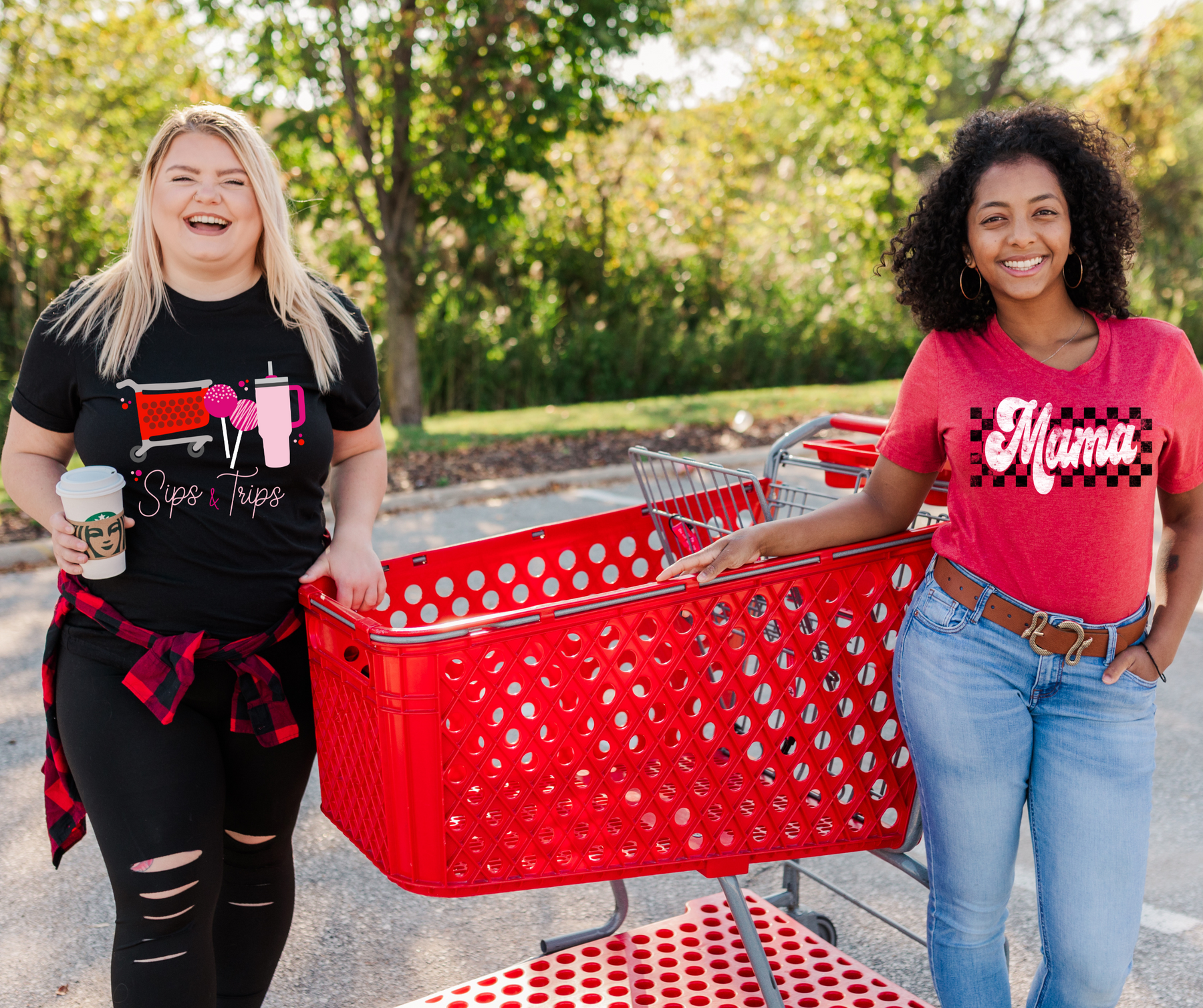Get ready to hit Target in style with our Sips & Trips Black Graphic Tee! Whether you're sipping from a Stanley cup or a Starbucks cup, this tee will keep you looking cool and feeling comfortable all day long.